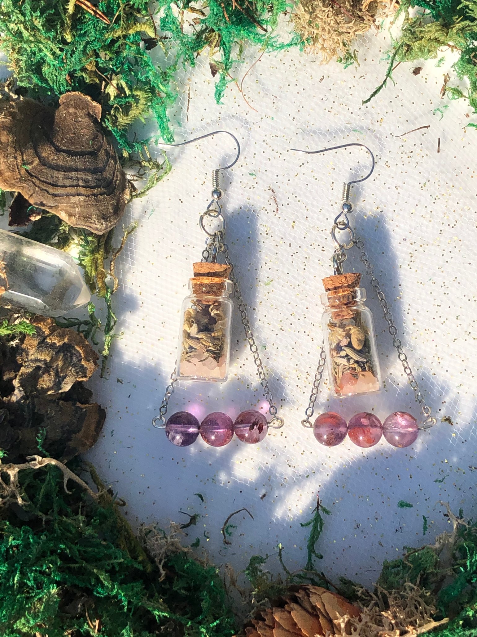 Grounding Spell Jar Earrings crafted with intentions to ease anxiety , purify wearers energy & help ground them to reality. Made with a special blend of magic infused herbs with Super Seven accent beads.
